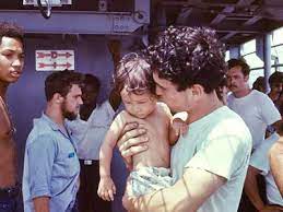 On one of the accounts from a Navy man who worked on USS Kirk during the Frequent Wind evacuation at the end of the Vietnam War (recording to be sent to his wife) “they tossed babies from 25 feet in the air, out of Chinooks, and we caught them like basketballs”.
